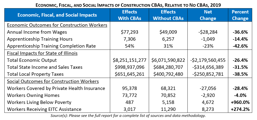 “To truly understand the importance of these CBAs to the region and to Illinois, we set out to examine what would happen if these agreements were not in place,” added University of Illinois Professor and PMCR Director Dr. Robert Bruno. “In addition to dramatic reductions in wages and health care coverage for represented workers, we found that the region would have created 13,000 fewer jobs, economic output would shrink by over $2 billion, and the state and local tax base would contract by more than half a billion dollars every year.”