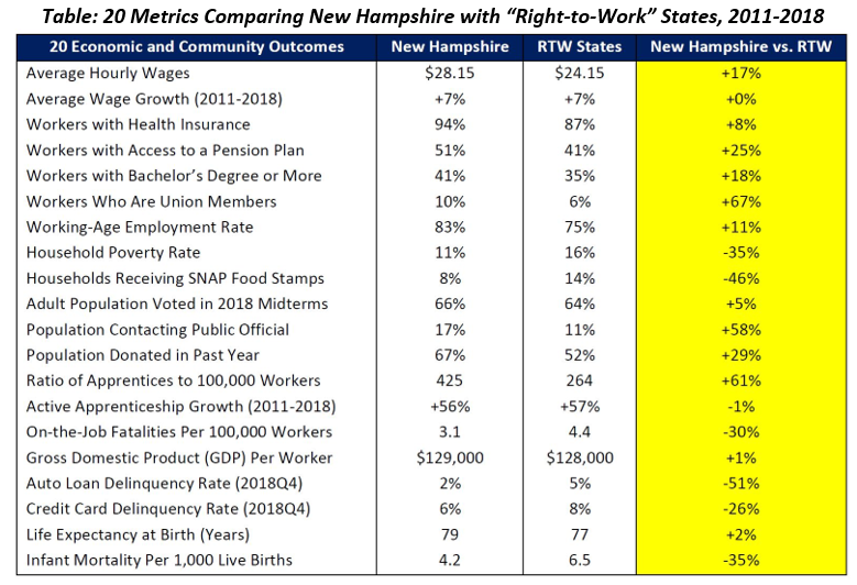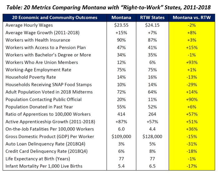 Efforts to push new “right-to-work” laws are currently underway in at least two additional states—Montana and New Hampshire.  Yet among twenty economic and community outcomes detailed in the report, both states currently outperform their “right-to-work” peers on at least 75% of the metrics.