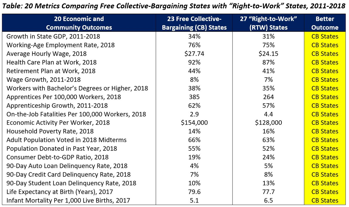 Read the report, Promoting Good Jobs and a Stronger Economy: How Free Collective-Bargaining States Outperform “Right-to-Work” States