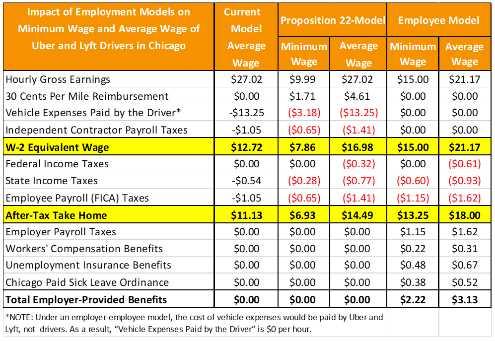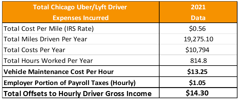 Manzo noted that drivers are not currently compensated for time spent waiting for ride requests or driving to pick up passengers. They also incur vehicle maintenance expenses and must pay the employer share of federal payroll taxes. Collectively, these variables can reduce gross hourly earnings by so much that the average Uber and Lyft driver in Chicago earns less than $13 per hour in W-2 equivalent wages. Classification as employees would guarantee at least $15 per hour—the current minimum wage in the city.