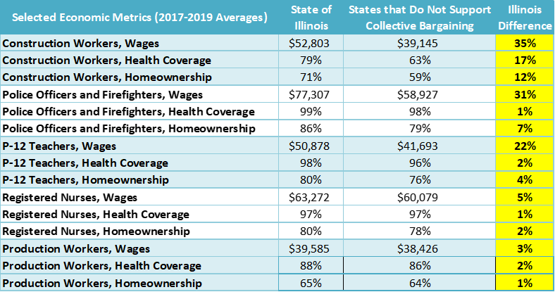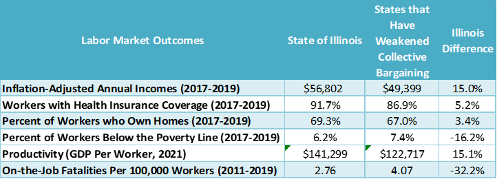 La Grange, IL: Illinois workers earn higher wages, deliver higher levels of productivity, are more likely to have health insurance, and are substantially less likely to suffer workplace fatalities than comparable workers in states that have taken policy actions to weaken unions and erode collective bargaining rights, according to a new study from the nonpartisan Illinois Economic Policy Institute (ILEPI) and the Project for Middle Class Renewal (PMCR) at the University of Illinois at Urbana-Champaign. The research comes as Illinois voters are set to weigh in on the Workers’ Rights Amendment, a November ballot question that would enshrine the right to unionize in the Illinois Constitution and prevent passage of any state law or local ordinance “that interferes with, negates, or diminishes the right of employees to organize and bargain collectively.”