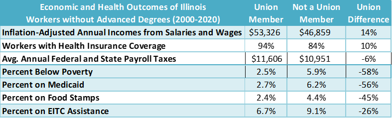 Analyzing two decades worth of data from the American Community Survey, the study found that union workers in Illinois earned 14% higher incomes on average, were about 10% more likely to have health insurance, paid more in state and federal taxes, and were half as likely to live in poverty or rely on government assistance as comparable nonunion workers.
