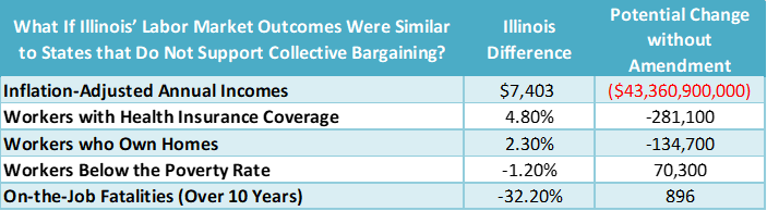 By examining additional American Community Survey, Bureau of Labor Statistics, and Bureau of Economic Analysis data, researchers were able to compare Illinois on other economic metrics to states that have weakened collective bargaining rights—and to assess the potential impact of the Workers’ Rights Amendment on additional variables ranging from workplace safety to rates of homeownership.