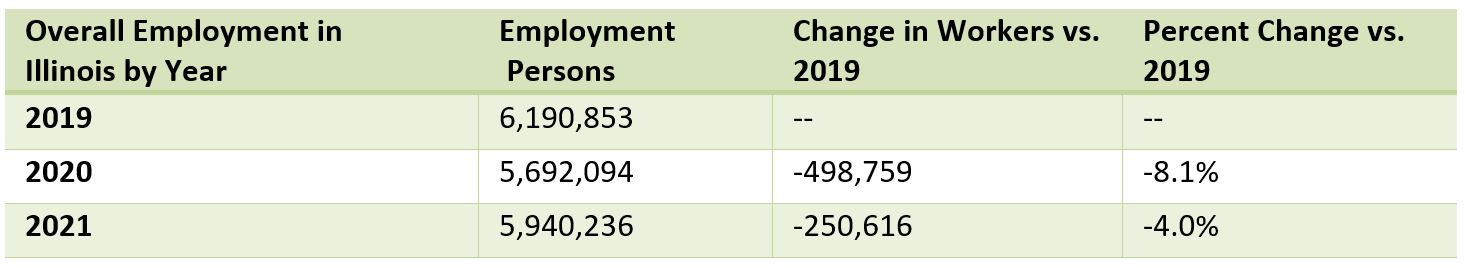 In particular, researchers noted that while Illinois recovered more than half the jobs it lost during the first year of the pandemic by the end of 2021, it still had about 250,000 fewer workers than it had in 2019, according to data from the U.S. Bureau of Labor Statistics (BLS).