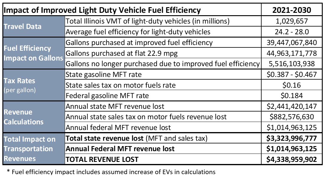 La Grange: Rising fuel efficiency standards and putting one million electric vehicles on the road over the next decade is projected to reduce the motor fuel tax revenues that Illinois would otherwise collect to support state and federal transportation projects by $4.3 billion, according to a new study by the nonpartisan Illinois Economic Policy Institute (ILEPI).