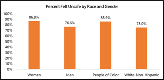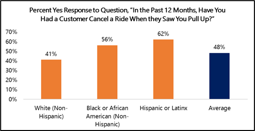 Though half of all respondents reported “flexibility” as the primary reason for working for app-based driving or delivery services, responses suggest that the impact of economic pressures on gig worker flexibility—pressures that may also be heightened by in-app customer rating systems—could also be impacting health and safety at work. For example, strong majorities of drivers reported routinely forgoing bathroom breaks, experiencing pain related to driving, and suffering from violence and harassment on the job. Women and people of color were most likely to report feeling unsafe on the job, with people of color also more likely to report having a ride canceled once they pulled up to pick up a passenger.