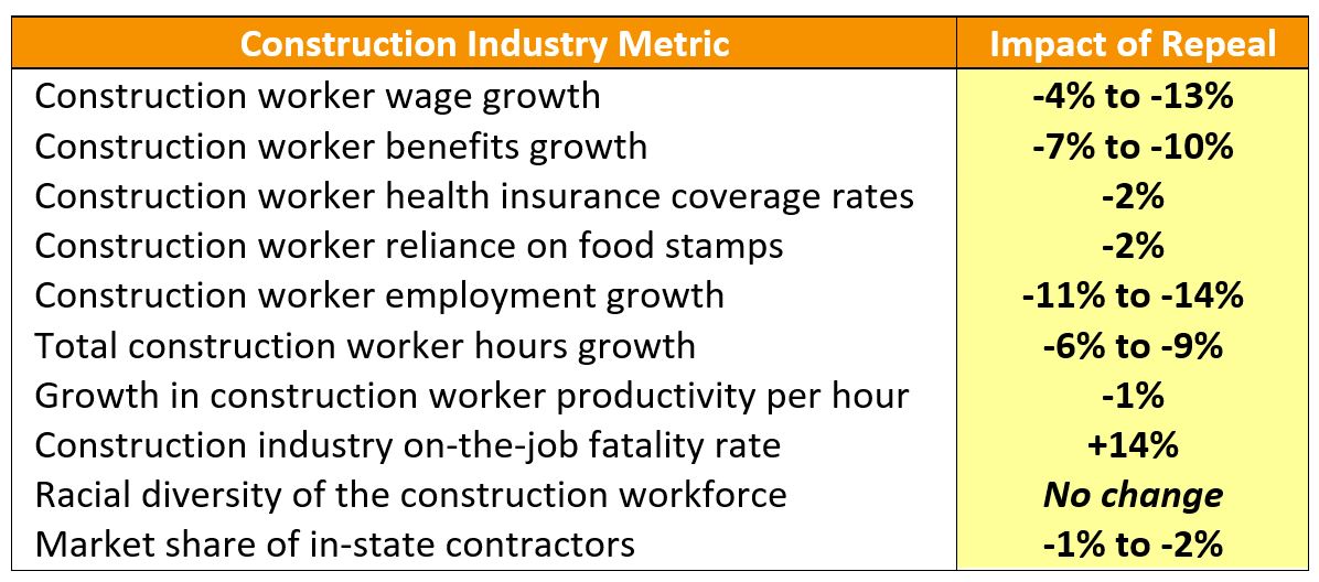 “While paying below-market rate wages fails to save taxpayer dollars on public projects, it does often translate into more safety problems on jobsites, a less reliable supply of the skilled workers to build and maintain critical infrastructure, and more construction workers reliant on welfare programs,” added study coauthor Dr. Larissa Petrucci. “Worse, the data shows that repeal states are collectively shrinking the market share of their own local construction businesses by billions of dollars each year, while stifling job growth in this critical sector of the economy by as much as 14%.”