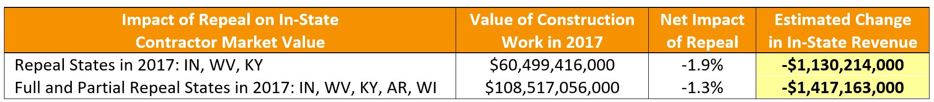 Recent analyses of pre- and post-repeal project costs in the states of Indiana, Wisconsin, and West Virginia have reached similar conclusions, and have also found that the repeals failed to increase bid competition on public works projects.