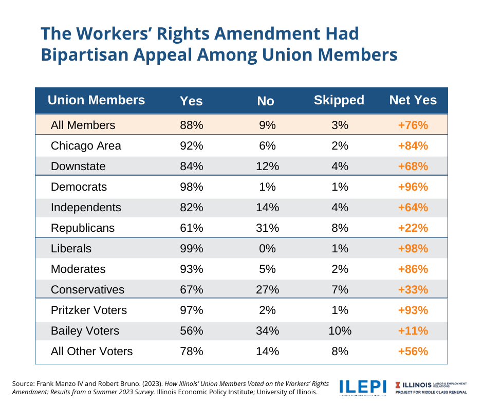 “Union members were motivated to vote yes to guarantee workers’ rights and to promote job quality in Illinois,” said ILEPI Economist and study coauthor Frank Manzo IV. “This built robust union solidarity that was clearly a contributing factor to the Amendment’s success.”
