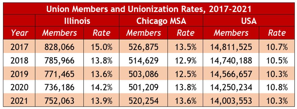 At 13%, Illinois currently has the nation’s 13th-highest unionization rate, with its workers 3 percentage points more likely to be union members than the nation as a whole. Black workers, military veterans, workers with master’s degrees, public sector employees, and construction trades workers continue to be the groups who are most likely to be unionized. Unions also boost worker earnings by an average of 13% in Illinois, which is the 3rd-highest impact in the nation. Finally, the report found that Illinois’ unionization rate was 5 percentage points higher than neighboring states with so-called “right-to-work” laws, while its worker wages had grown 5% faster since 2017 and were now an average of 19% higher.