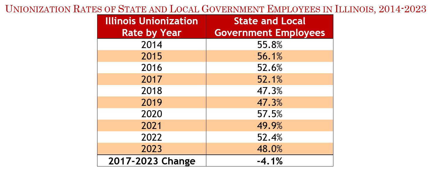 Despite these signs of resurgence, researchers noted that the overall rate of unionization in both Illinois and the nation as a whole continued to decline, driven by the loss of membership in the heavily unionized public sector following the Supreme Court’s 2018 Janus decision that imposed “right-to-work” conditions on public sector employees nationally. “Right-to-work” conditions require unions to provide services and representation to non-members for free. Both Illinois’ and the nation’s public sector unionization rates have declined since this decision, with Illinois’ state and local government unionization rate dropping by 4 percentage points.