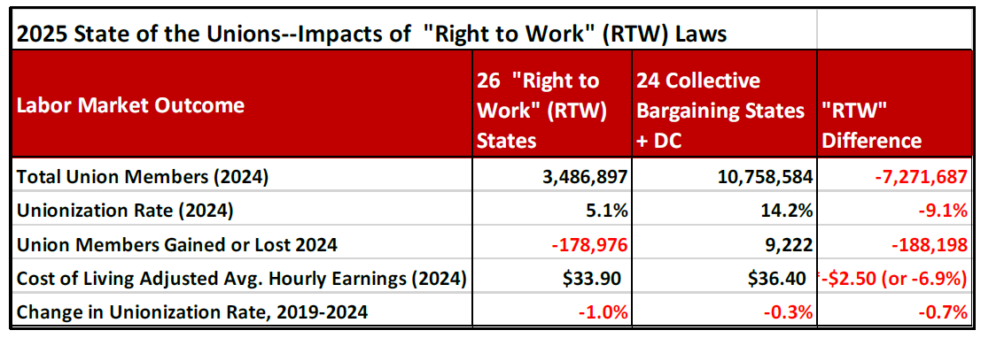 The report concludes that one of the biggest policy distinctions affecting union membership nationally is the presence of so-called “right to work” laws, which have been adopted in 26 states and been imposed on public sector workers in all 50 states by the US Supreme Court’s 2018 Janus vs. AFSCME decision. These laws allow workers who are represented by unions to stop paying for the services they receive, thereby starving unions of the resources they could otherwise use to organize new workers or negotiate over things like wages and working conditions. The State of the Unions 2025 report shows that “right to work” states have fewer union members, dramatically lower unionization rates, and their workers earn around 7% lower wages on average—even after accounting for local differences in the cost of living.