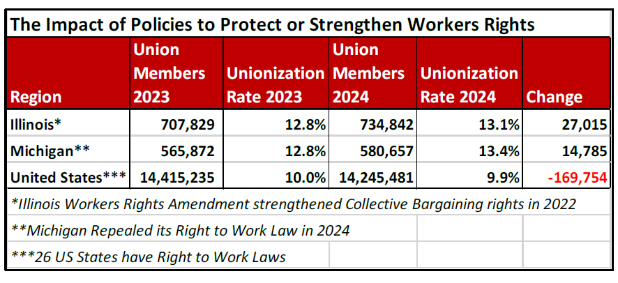 Similarly, the State of Michigan repealed its “right-to-work” law in early 2024 and subsequently gained 15,000 union members last year. In the 11 years Michigan’s “right to work” law had been in effect, the state lost nearly 70,000 union members and saw its union density fall by more than 21%. Last year alone, its union density increased by more than 5% relative to the prior year (from 12.8% to 13.4%).