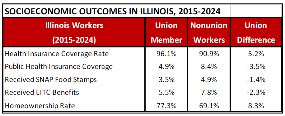 Researchers also analyzed Current Population Survey data from the U.S. Census Bureau and Bureau of Labor Statistics (BLS) (2015-2024) to identify additional economic trends within Illinois’ union and non-union workforce segments. They further concluded that Illinois’ union members earned 12% higher wages on average, were 8% more likely to be homeowners, 5% more likely to have health insurance coverage, and were substantially less likely to rely on Medicaid, food stamps (SNAP), and Earned Income Tax Credit (EITC) government assistance.
