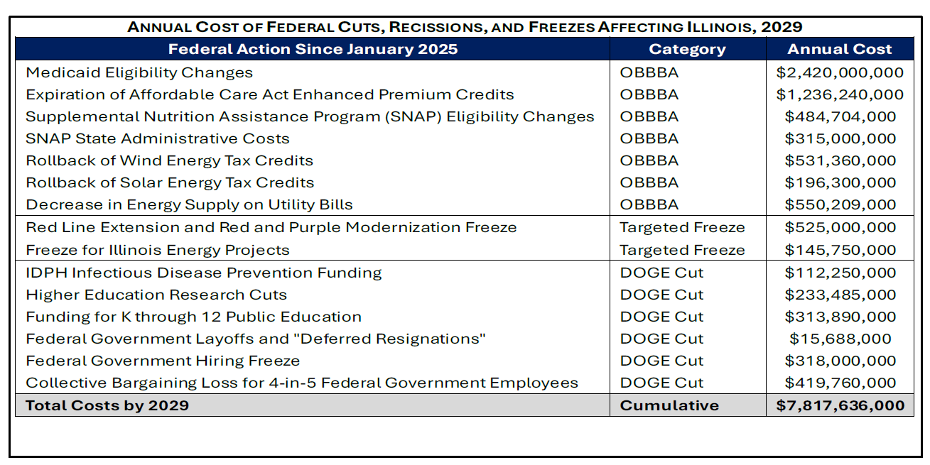 In an attempt to address negative impacts of these federal cuts and freezes, Governor Pritzker issued an Executive Order in September calling for agencies to identify cost efficiencies and reserve 4% of General Fund appropriations. Researchers cautioned, however, that these actions may only offset a fraction of the impacts of the Trump cuts and that additional revenue sources may be needed.