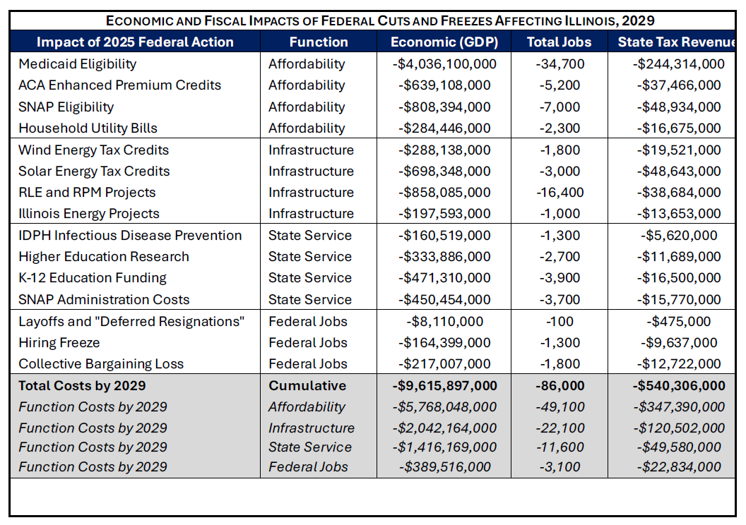 La Grange, IL: By the end of President Trump’s term, the wave of project cancellations, funding recissions, mass federal firings, and cuts to public health, nutrition, infrastructure, education, and other programs enacted by the administration in 2025 will amount to nearly $8 billion annually in lost revenue and increased out-of-pocket expenses, shrink the economy by $10 billion per year, and cost the state 86,000 jobs—according to a new analysis by the nonpartisan Illinois Economic Policy Institute (ILEPI) and the Project for Middle Class Renewal (PMCR) at the University of Illinois at Urbana-Champaign. The report also finds that these actions will cause hundreds of thousands of Illinois residents to lose access to health insurance coverage and food assistance, while shrinking state tax collections by more than $1 billion per year.
