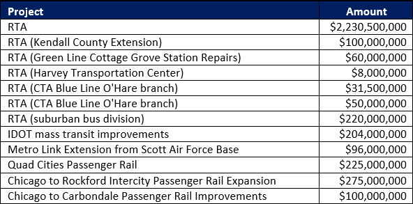 In addition to dedicated, annual capital funding, transit agencies statewide receive further funding through Rebuild Illinois’ bonding component. The following transit and passenger rail projects were outlined in the project list of Rebuild Illinois (Public Act 101-0029). The RTA receives $2.7 billion, while IDOT receives $204 million for public transportation improvements.