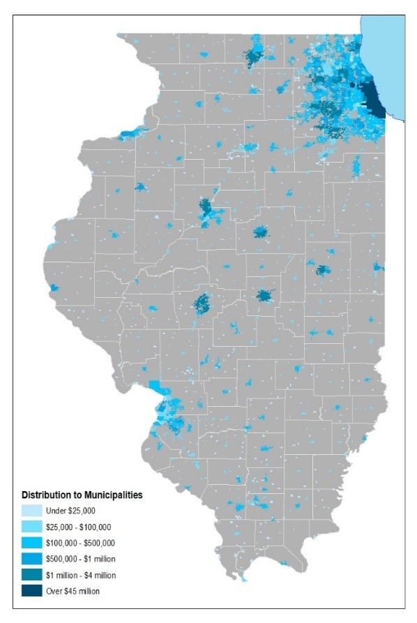 Municipalities across the state are estimated to receive an additional $188 million annually, while Cook County receives $64 million, all other counties receive almost $70 million, and townships and road districts receive almost $61 million, as summarized below.