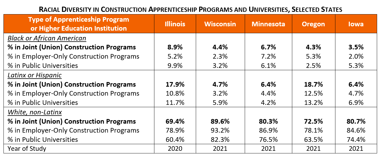 Relative to public universities, this research also found that joint-labor management programs enrolled a higher share of Black or African American trainees in three of the five states studied, and a higher share of Hispanic or Latinx trainees in four of the five states studied.
