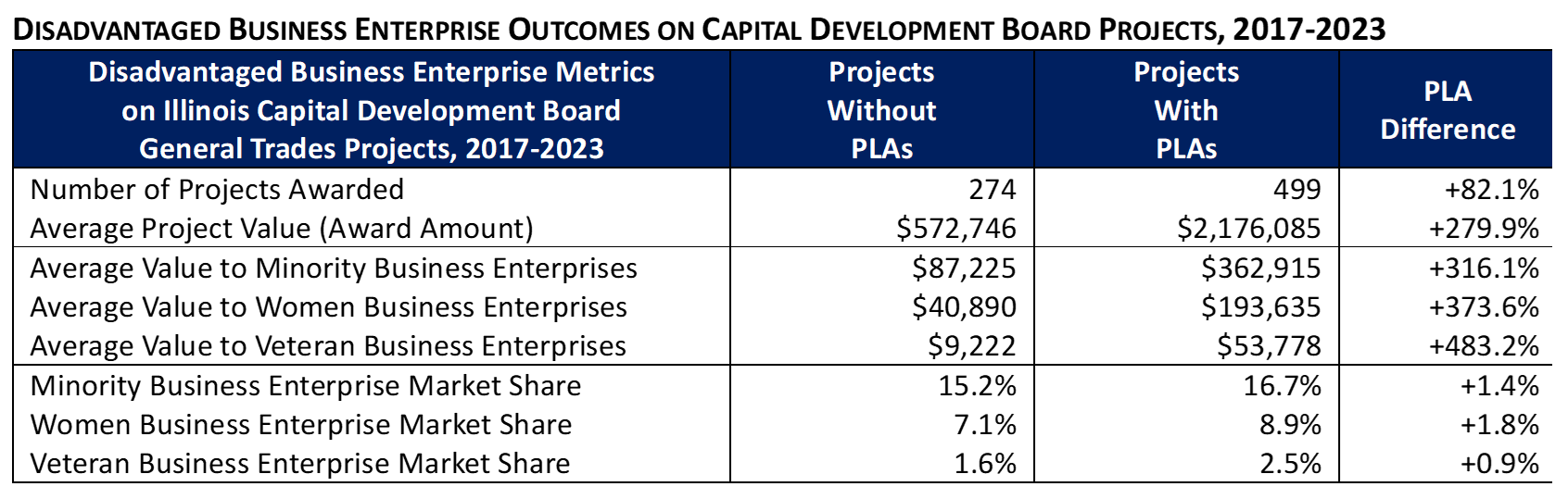 The report notes that during the study period, Illinois saw a 28 percent increase in skilled trade apprenticeship enrollments. As demand for construction services boomed in recent years, so did reported shortages of skilled labor. This led elected officials and industry leaders to seek out new ways to expand access to new businesses and domestic labor supply pools, particularly among workers and entrepreneurs who have historically been underrepresented in the industry. The data shows that PLAs offer a potential solution. For example, PLAs produced an increase in market shares for firms owned by military veterans, women, and people of color by as much as 2 percent.