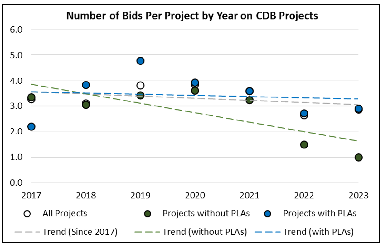 In every year but one, PLA covered projects averaged more bidders per project, delivering an average of 14% more overall bid competition after controlling for project size and complexity, project location, project type, and other factors using common statistical techniques known as “regressions.” Similarly, researchers were also able to parse out impacts on both the overall cost of projects and the likelihood that projects were awarded at an amount below their initial engineer’s estimates. Each additional bid was correlated with a 4 percent decrease in the award amount (or project cost to taxpayers) and a 6 percent increase in the likelihood that a project was awarded for less than initial estimates. In summary, while PLA-covered projects tended to be larger and more complex than the non-PLA alternative, they were no more costly to build after controlling for other important factors.