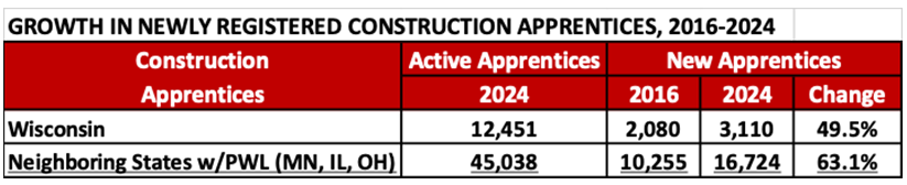 La Grange, IL: Alongside historic investments in infrastructure, energy systems, and domestic manufacturing, registered apprenticeships in Wisconsin’s construction industry have increased by nearly 50% over the past eight years, but this growth has lagged neighboring states that maintained policies that promote workforce training investments—according to a new study by the nonpartisan Midwest Economic Policy Institute (MEPI) and the Project for Middle Class Renewal (PMCR) at the University of Illinois at Urbana-Champaign. The report finds that joint labor-management programs affiliated with building trades unions are attaching the lion’s share of new workers to careers in the industry, and delivering graduation rates and job quality that rival Wisconsin’s four-year public universities.